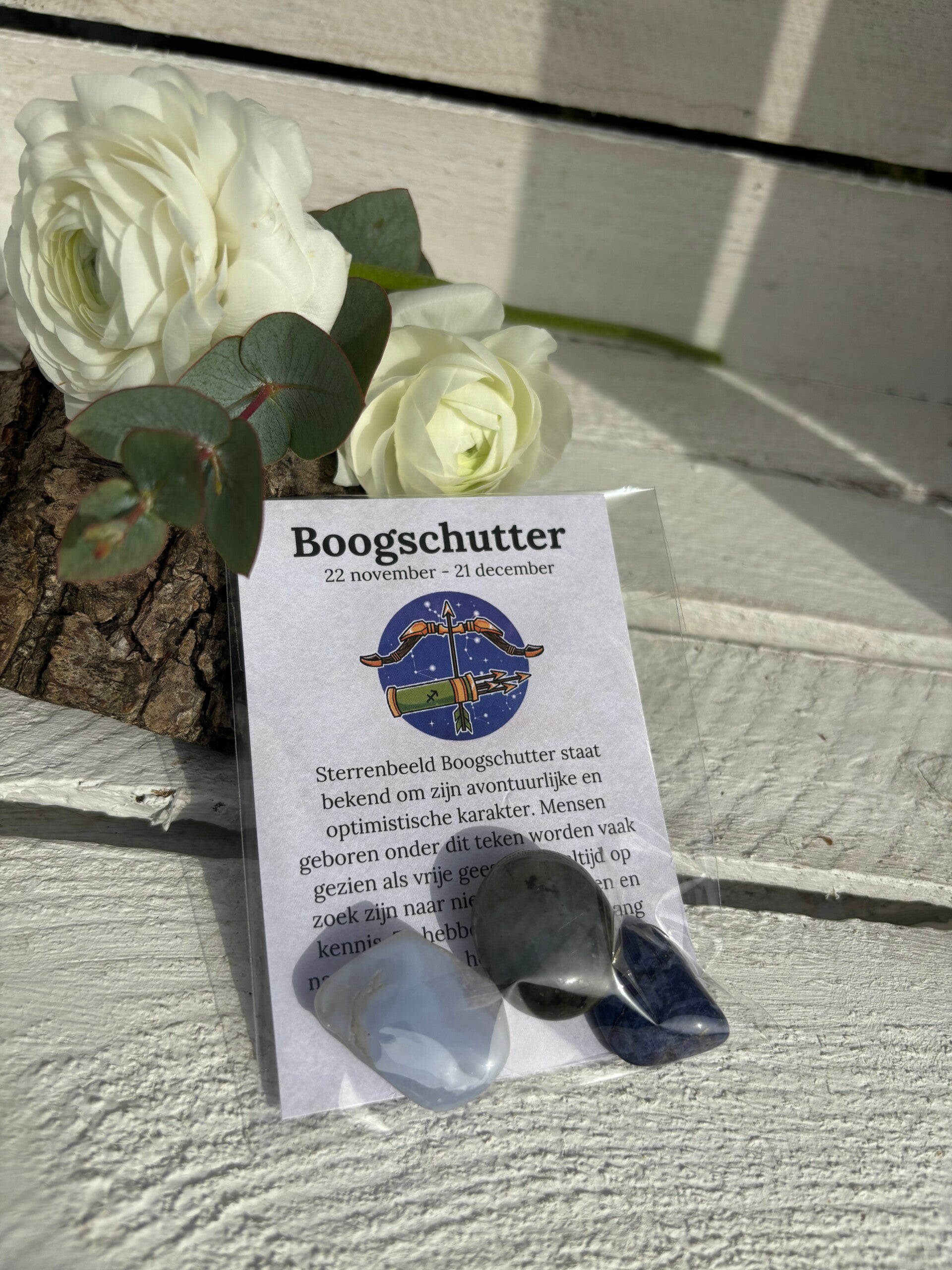 Bij elk sterrenbeeld passen edelstenen die de eigenschappen van het sterrenbeeld versterken. Ook zit er een kaartje bij met de werking van de stenen.