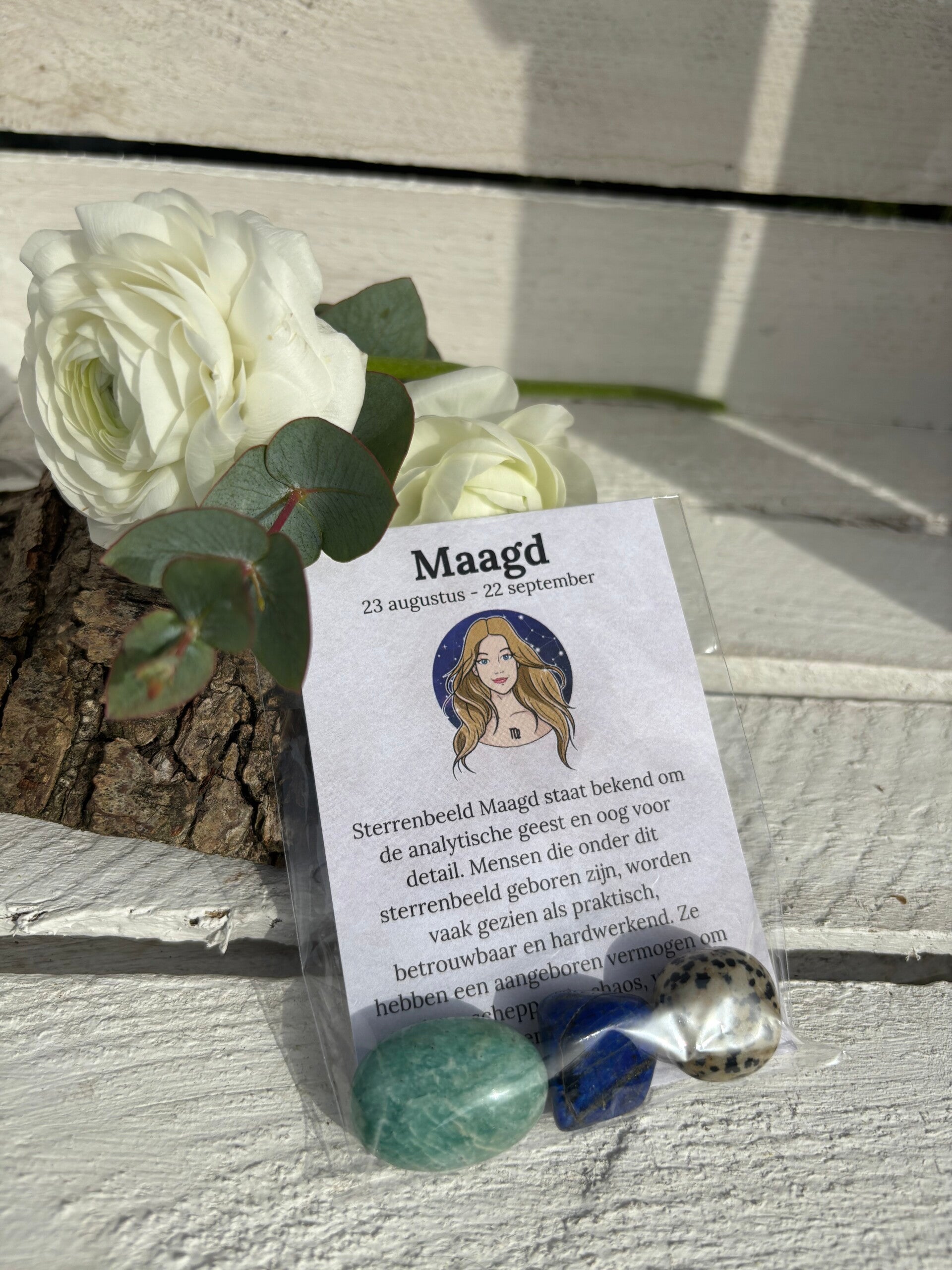 Bij elk sterrenbeeld passen edelstenen die de eigenschappen van het sterrenbeeld versterken. Ook zit er een kaartje bij met de werking van de stenen.