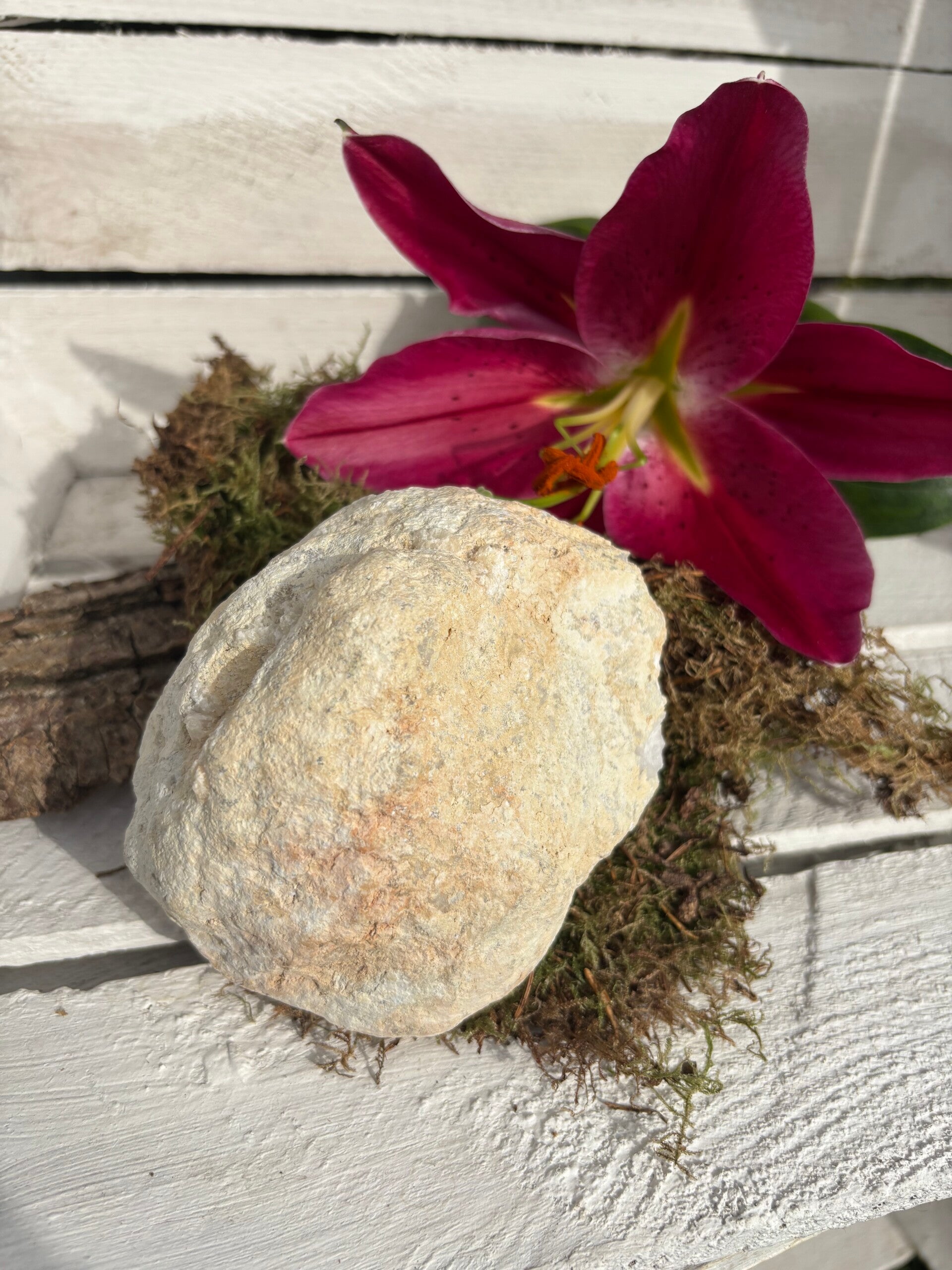 Een kwarts geode is een holle steen met een ruwe buitenkant en een kristallijne binnenkant. Een zeer sterke genezer en energieversterker. Reinigt en versterkt alle chakra's en organen en brengt deze in balans.